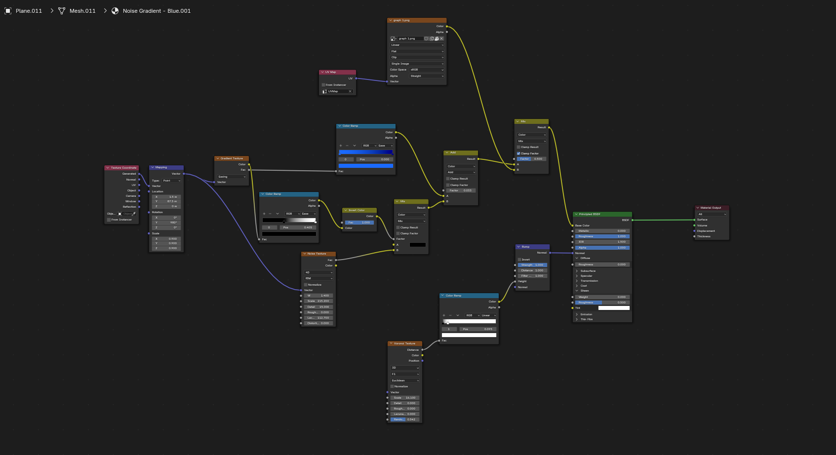 As mentioned above, we will take a deep dive into the materials used in this scene. As you can see in the graph below, I have created a gradient texture as a base. Added some fine detail with the normal mapping. BUT the new technique comes in at the top of the graph. We are using our UV decal map as the vector position for that image node. This is something that was not obvious to me as I started my 3D journey. MULTIPLE UV maps, VECTOR DATA? What is all of this?