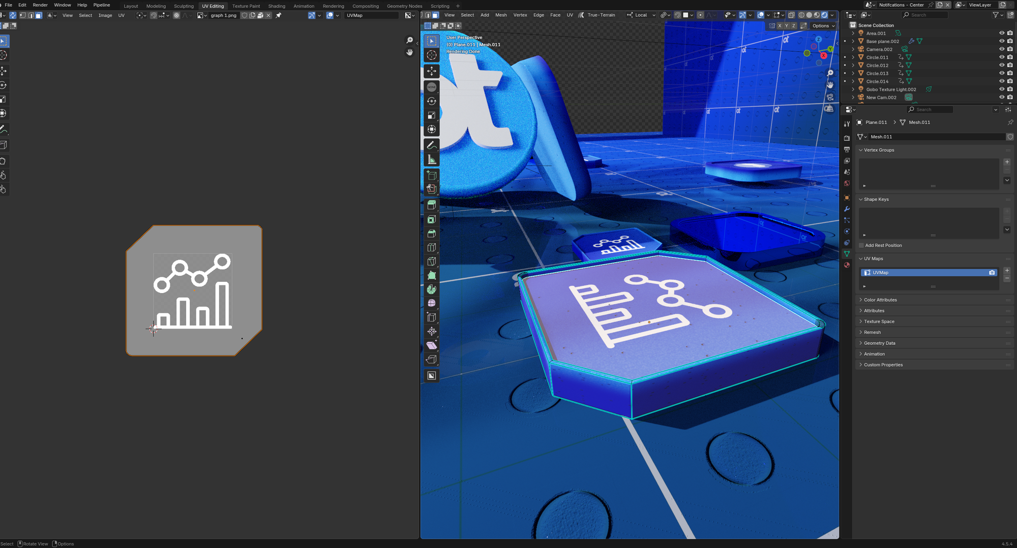 UV texture mapping is nothing new, and we're all familiar with its principles; however, with this project, I wanted to experiment with specific UV decal mapping. The ability to store many UV maps on objects lets us single out specific areas or faces that we wish to texture in a unique way. In the example below, I am mapping this icon onto the top face. We will get into this more in the materials section below!