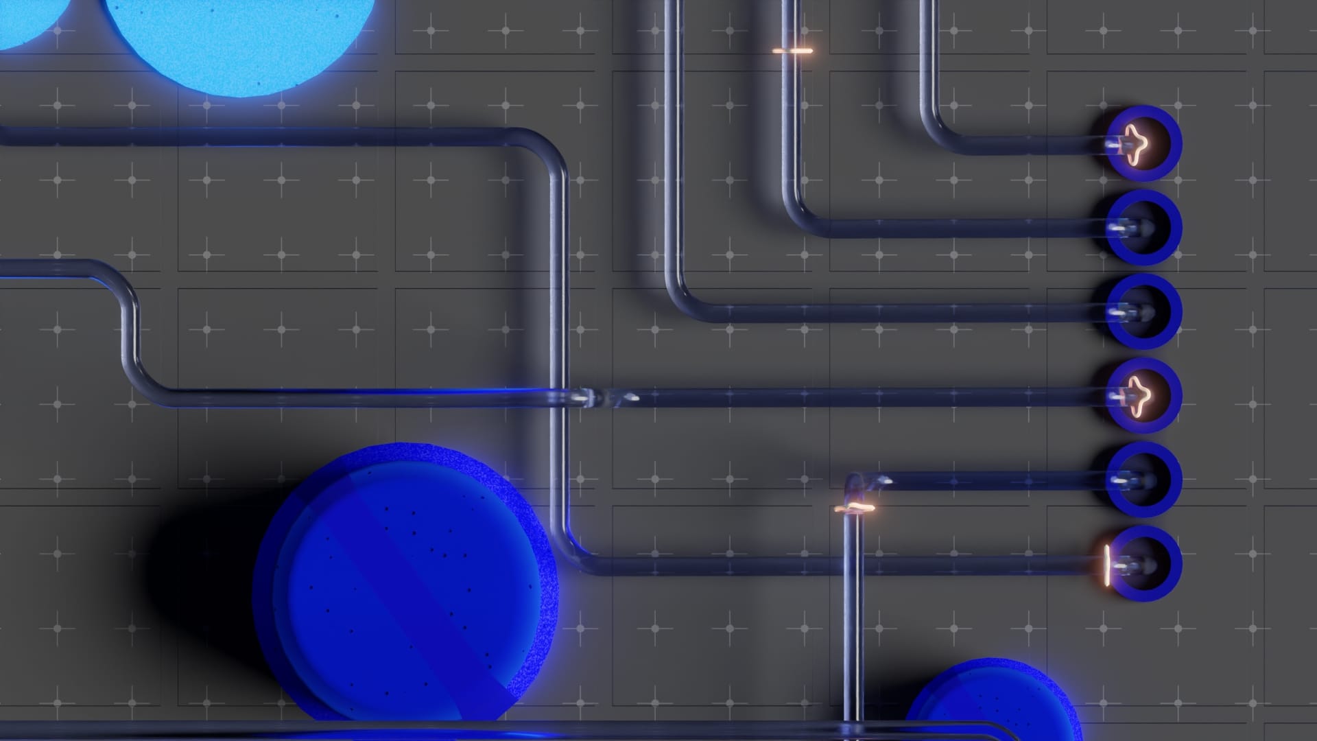 All of the materials in this scene attempted to convey a high-tech feel, something rooted in math and science. I attempted to create a simple grid that most of the later materials were based on. The glass tubes, for example, were meant to represent trace on an integrated circuit board.